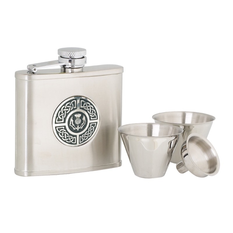 4oz Celtic & Thistle Stainless Steel Hip Flask Set with Captive Top in a Polished Finish.