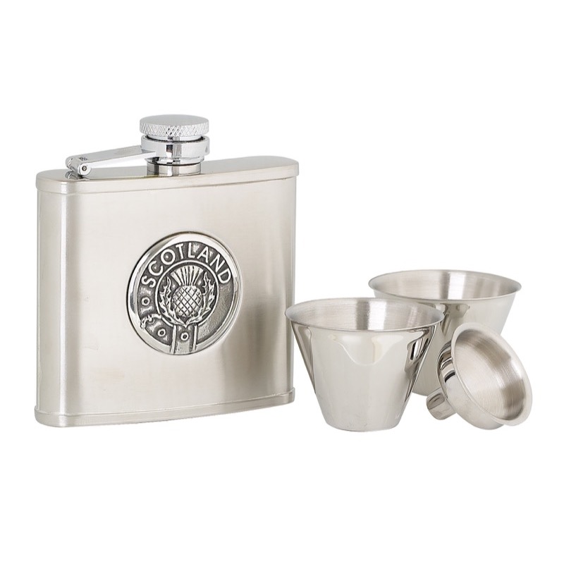 4oz Scotland Stainless Steel Hip Flask Set with Captive Top in a Polished Finish.