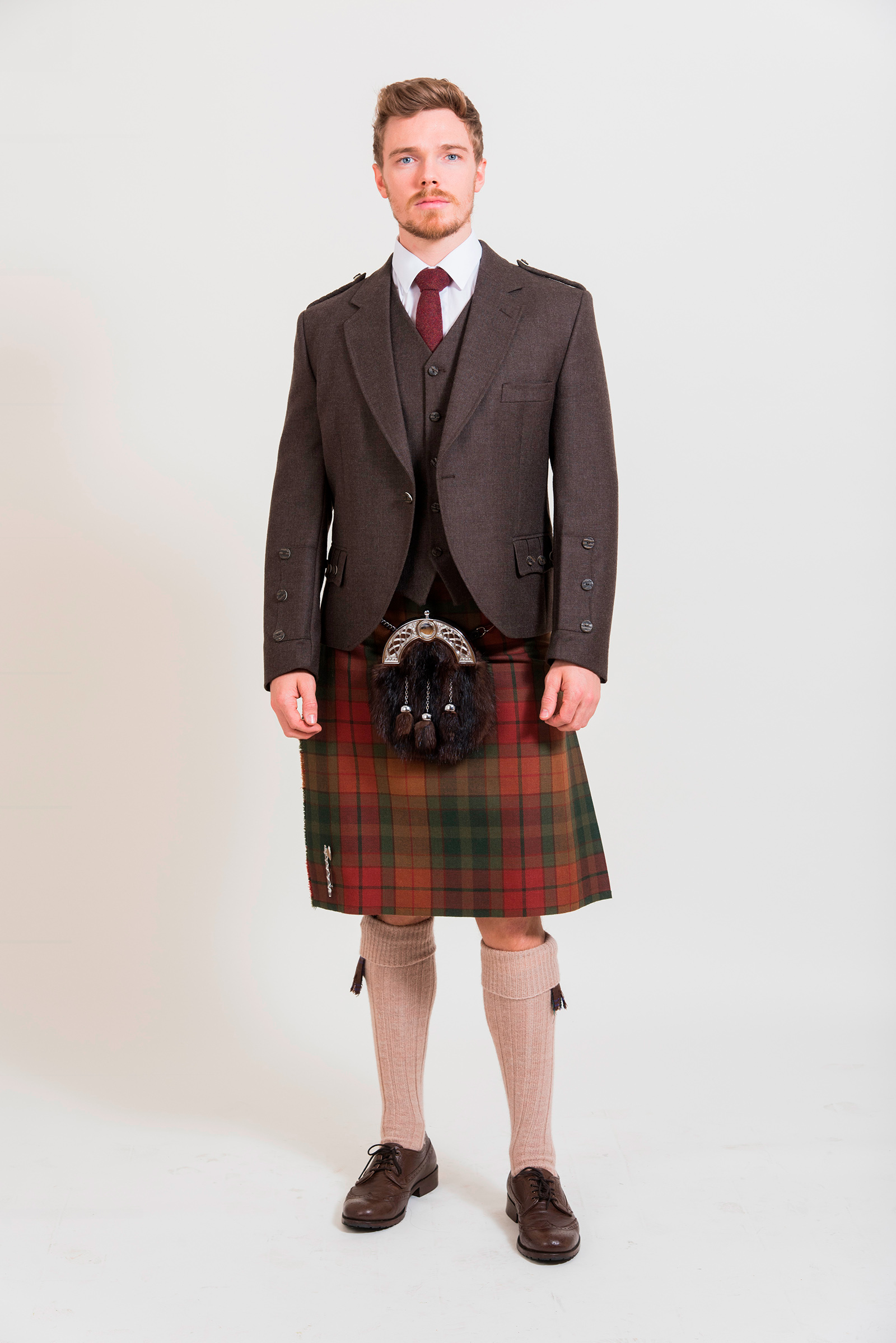 The images shown feature the Cullins of Skye Tartan Kilt with the Crail Outfit – Peat Brown.