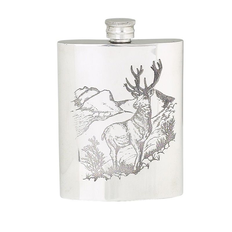 Finest handmade pewter flask with etched stag design.
