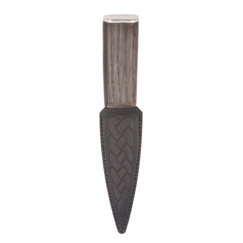 This daywear Sgian Dubh comes with a stainless steel blade & has a genuine hand carved bog oak wood handle.
