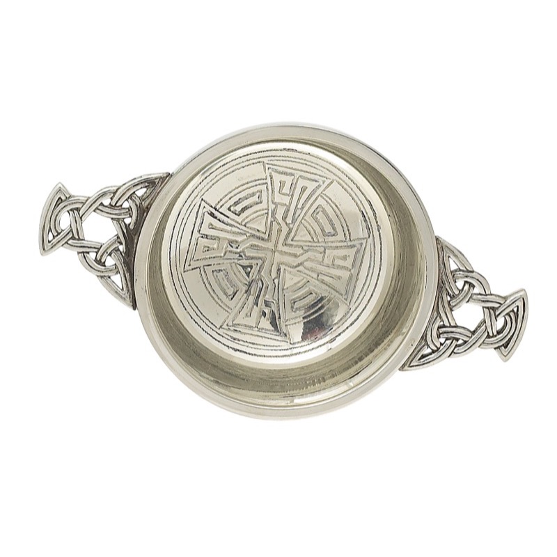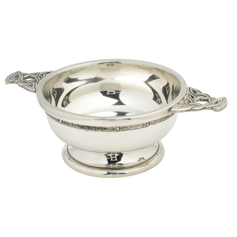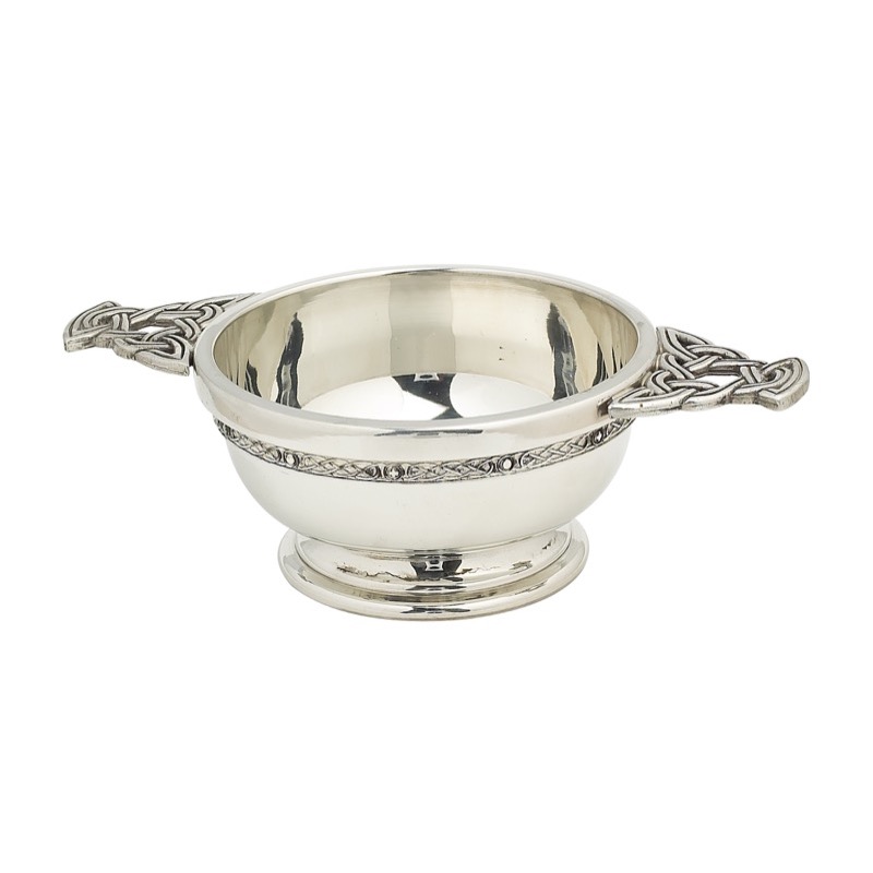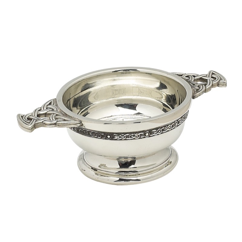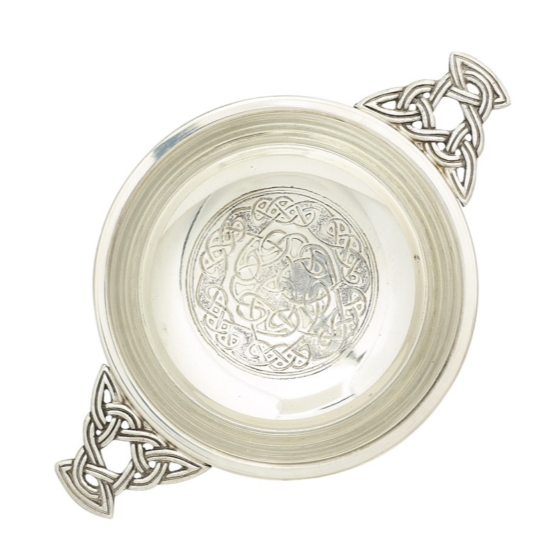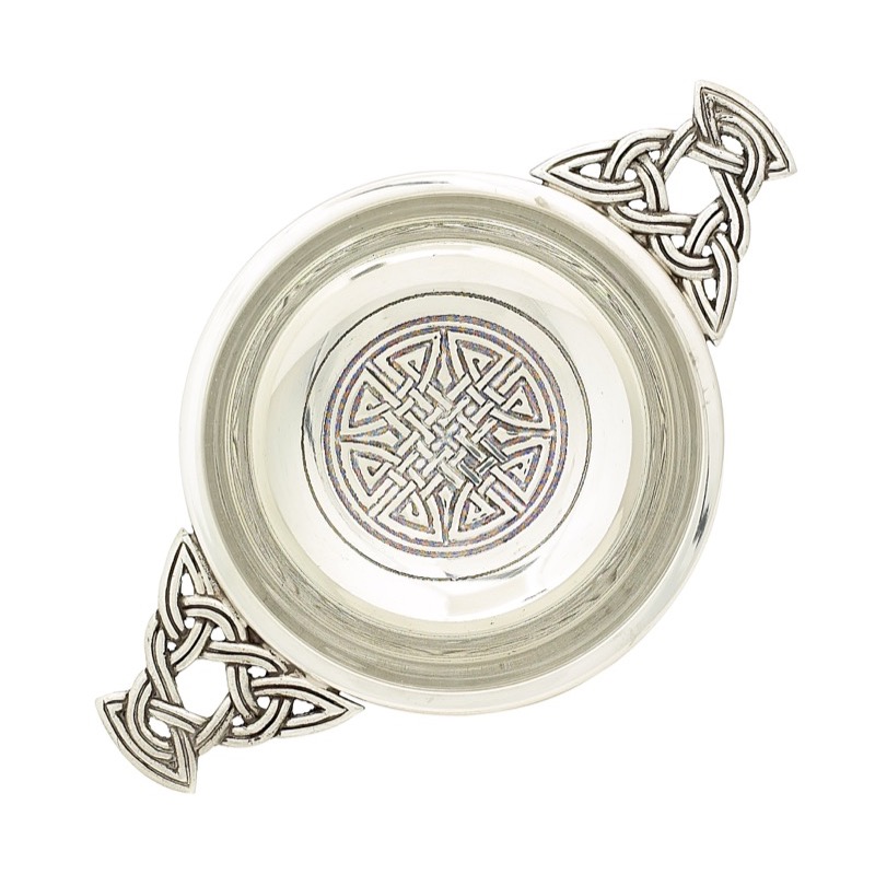 Celtic Weave Polished Pewter Quaich With Interior Design.