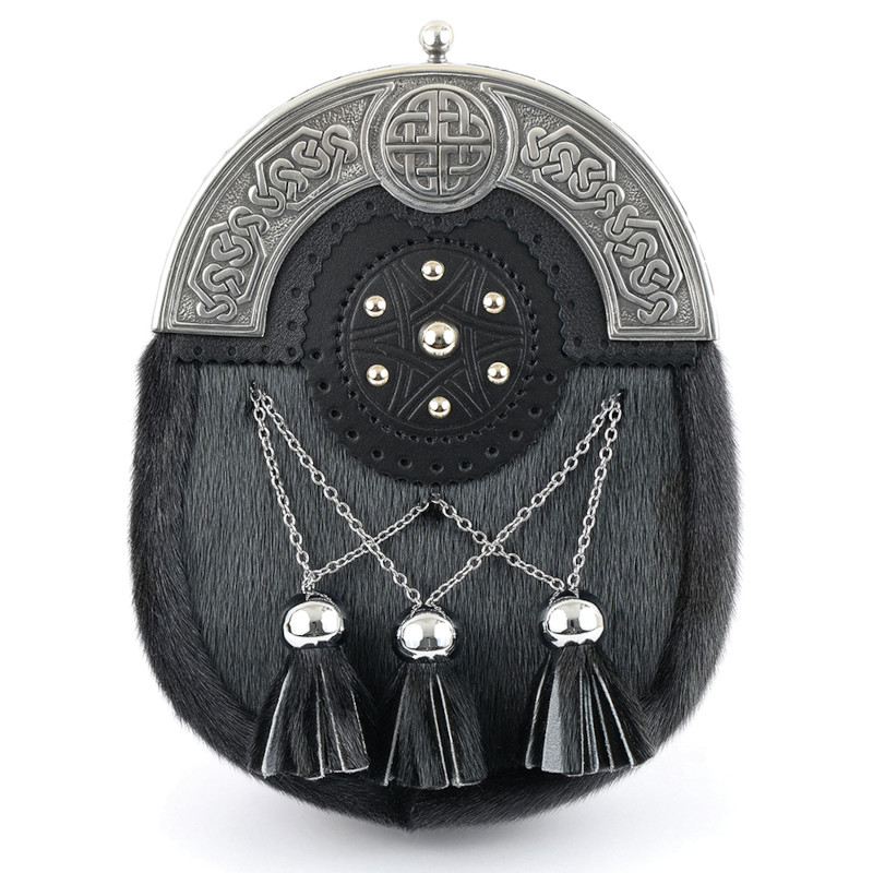 This beautiful Dress Sporran is handmade and finished by a team of expert sporran makers and features a Celtic inspired cantle, studded targe and chrome bells. Constructed using the highest quality skins it is the perfect accessory for your kilt and can be worn with evening wear to more formal functions. Choose from a range of leather finishes and interior suede finishes.