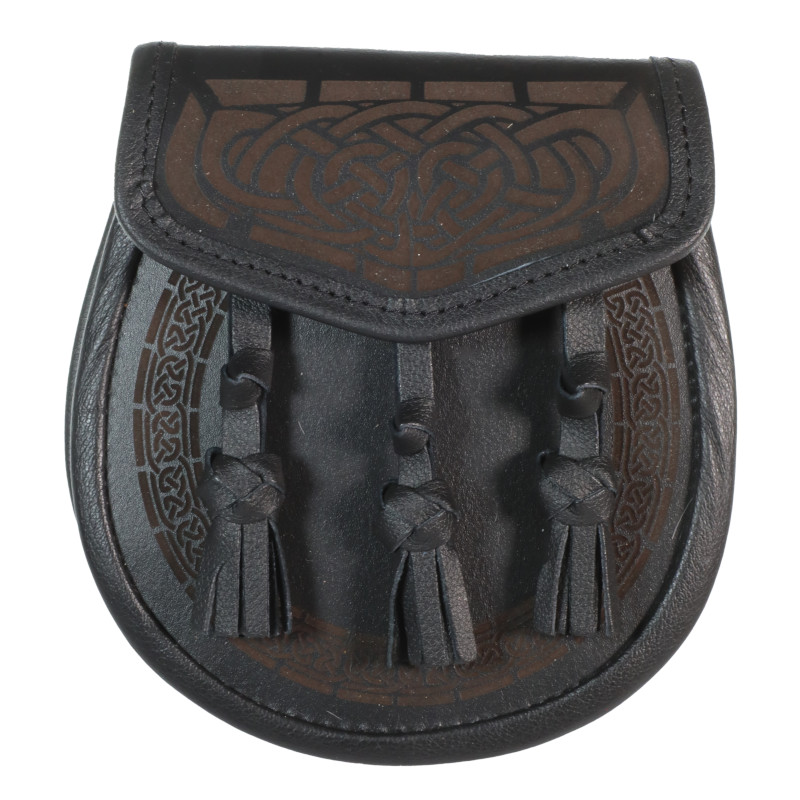 Traditional Leather Daywear Sporran handmade and finished by a team of artisan sporran makers. This laser-etched leather sporran is rich in Celtic design. Finished with 3 pleated leather tassels.
