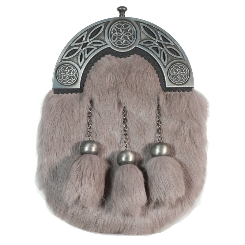 This Stunning Grey Rabbit Fur Sporran is handmade and finished by a team of expert sporran makers and features a Celtic inspired cantle and chrome bells. Constructed using the highest quality Grey Rabbit Fur it is the perfect accessory for your kilt and can be worn with evening wear to more formal functions. Choose from a range of leather finishes and interior suede finishes.