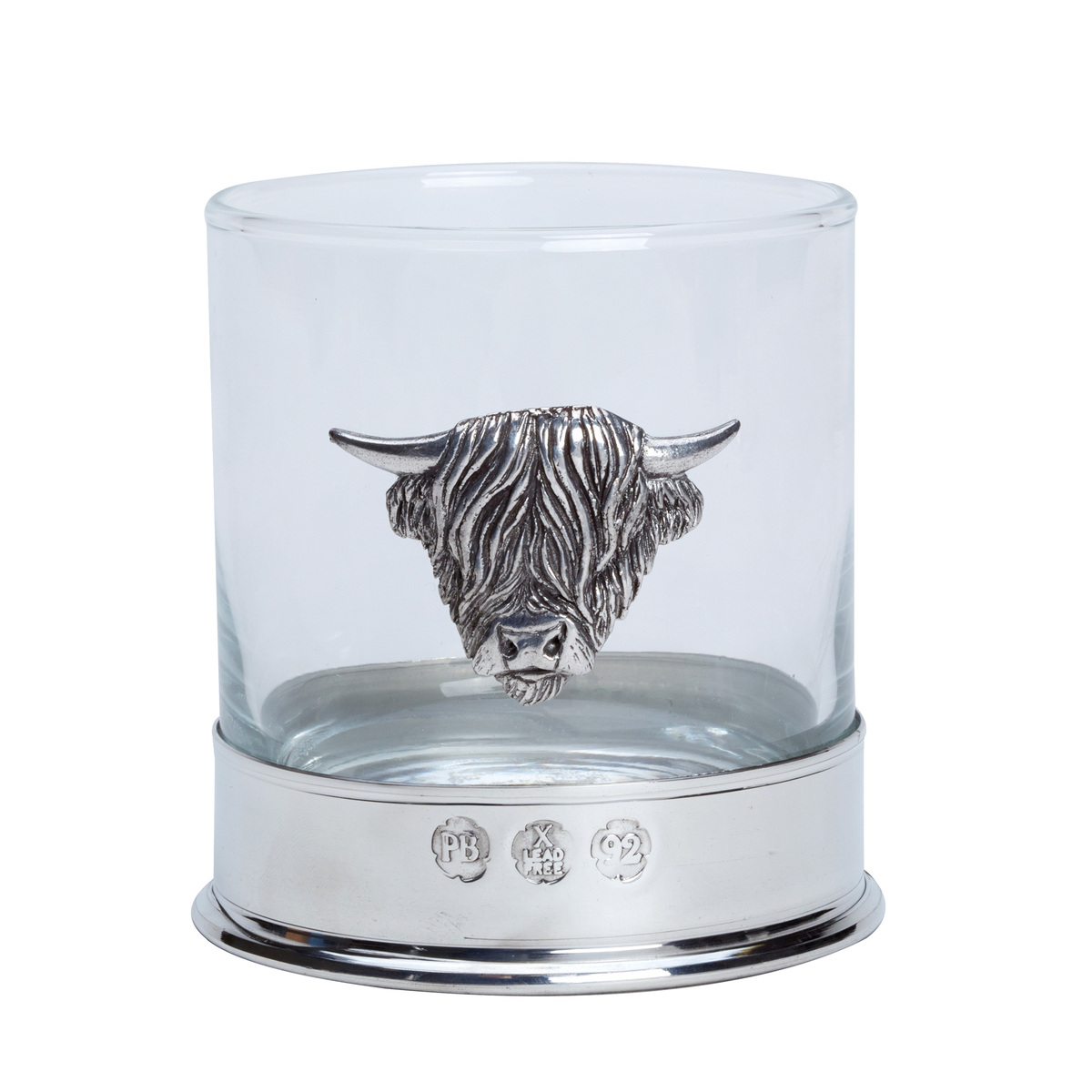 Whisky Glass with handcrafted highland cow pewter design and base.