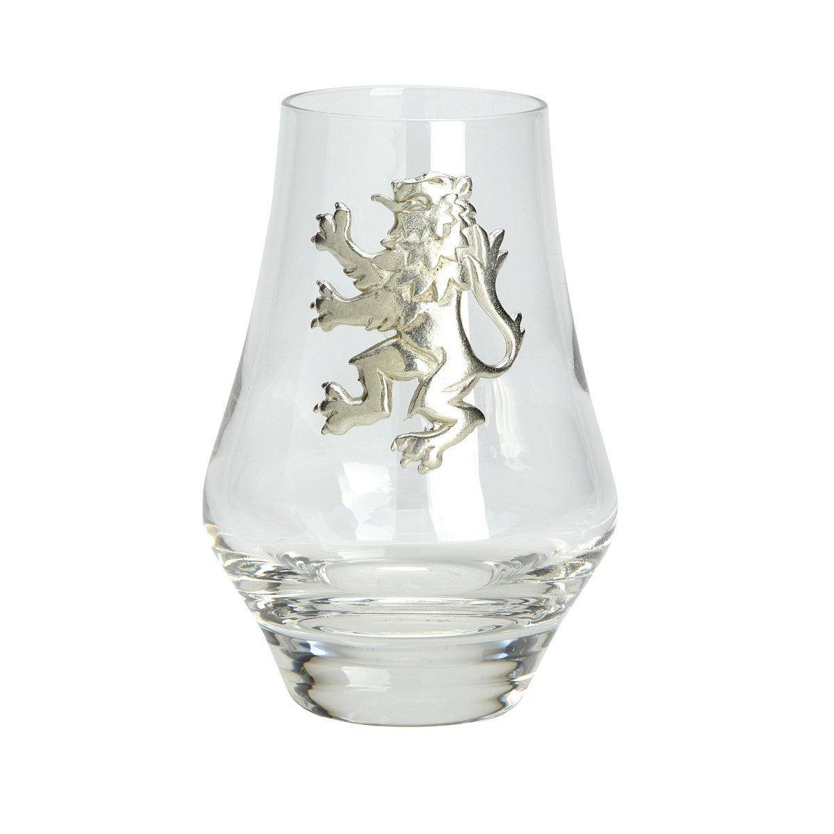 Tasting glass with handcrafted Scottish lion rampant pewter design.