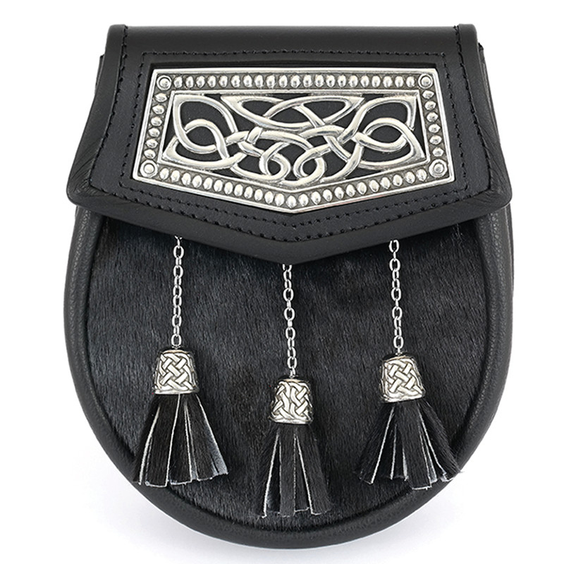 This semi-formal leather hide and skin sporran features a Celtic design Prince Charlie Plate and matching pewter sporran tassel bells.