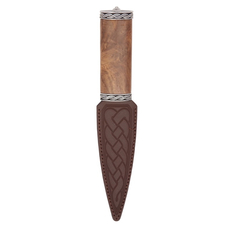 This daywear Sgian Dubh has celtic pewter mounts & comes with a stainless steel blade & has a genuine hand carved rosewood handle.