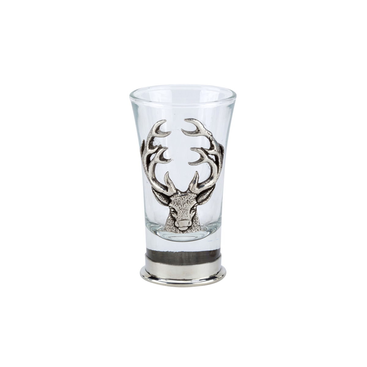 Shot glass with handcrafted stag head pewter design and base.