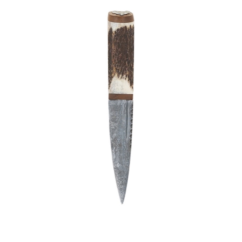 Scottish Staghorn Staghead Damascus Sgian Dubh with Brown Leather Sheath.