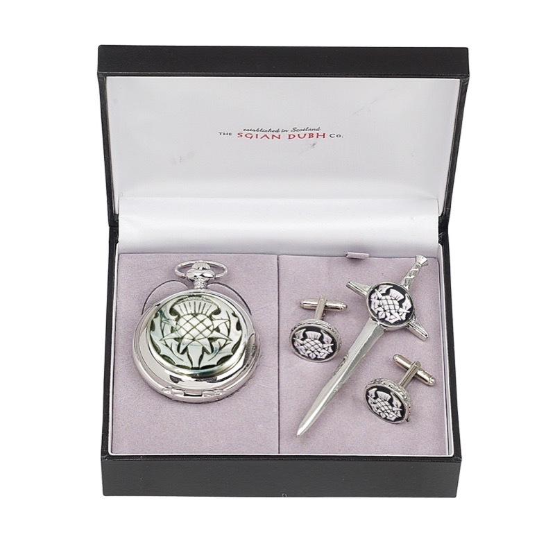 This elegant pocket watch gift set will enhance any kilt or other dress outfit.